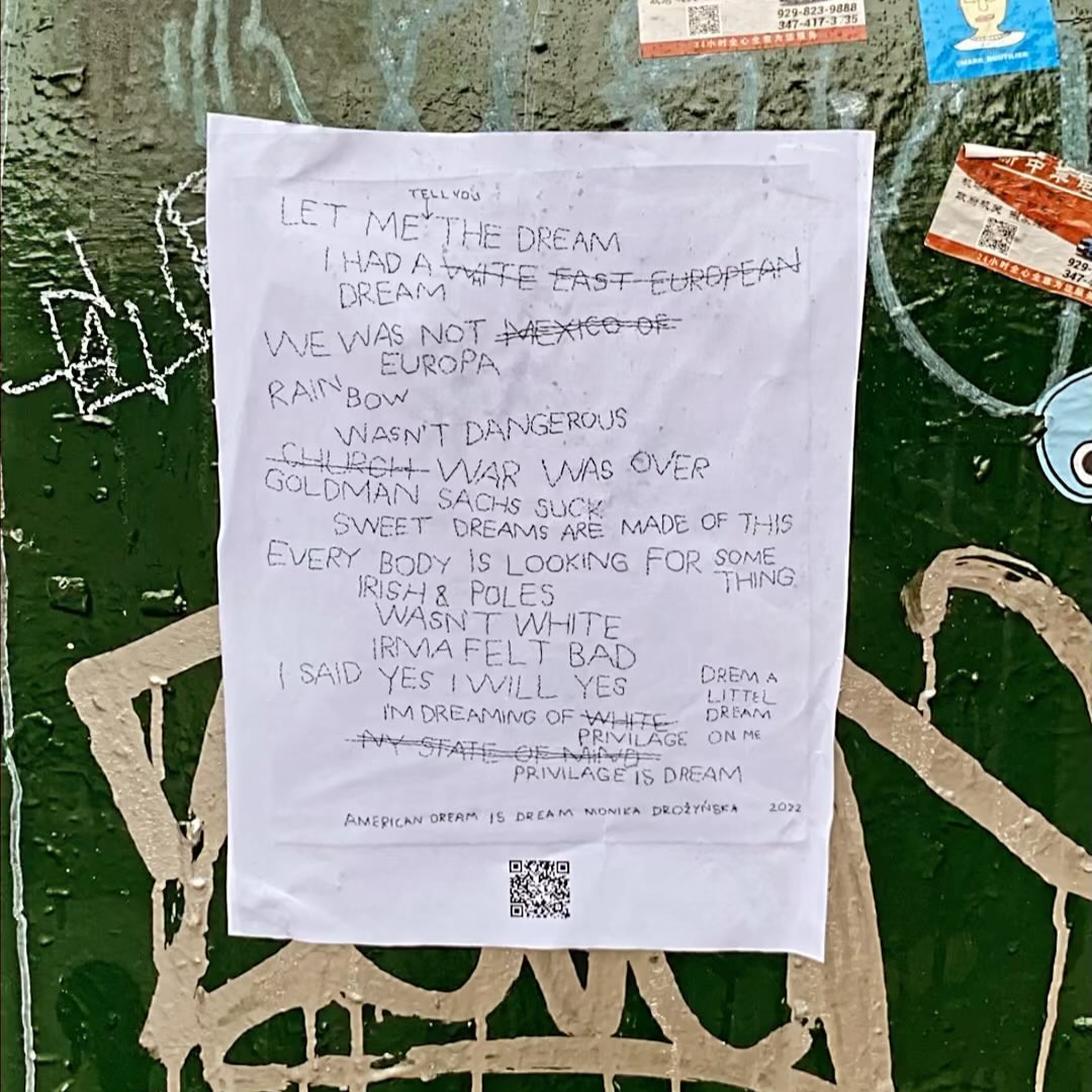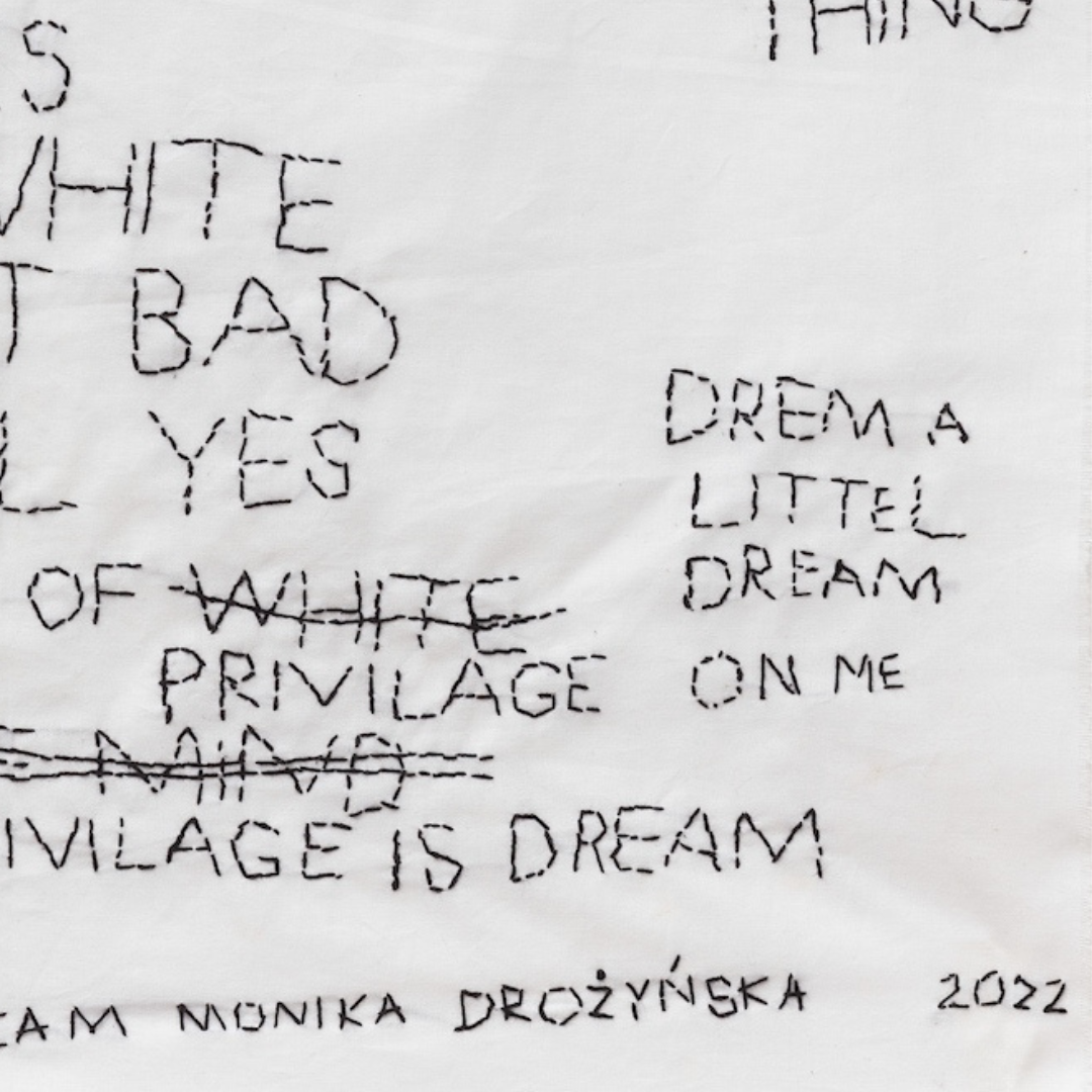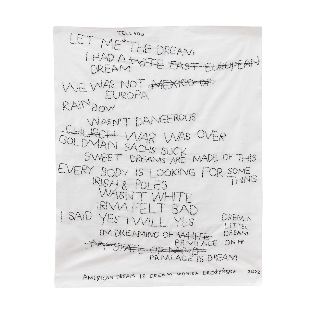 American dream is dream to wiersz o śnieniu. W hafcie parafrazowane są fragmenty z teorii feministycznej, psychoanalitycznej, popkultury, polityki. Drożyńska cytuje Hélène Cixous, Martina Lutra Kinga, Zygmunta Freuda, Annie Lennox, Irving Berlin, Occupy Wall Street. Tworzy oryginalny język pisany haftem z formalnymi zabiegami przekreśleń, którymi zapisuje uczucie frustracji, stan pomiędzy: zgodę z równoczesną niezgodą. Używa błędów do wprowadzenia freudowskich pomyłek w język pisany. Fantazję o kulturze amerykańskiej łączy z Polską i Europą Wschodnią.