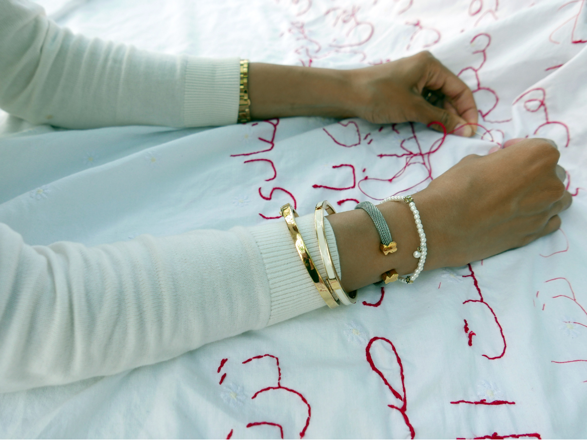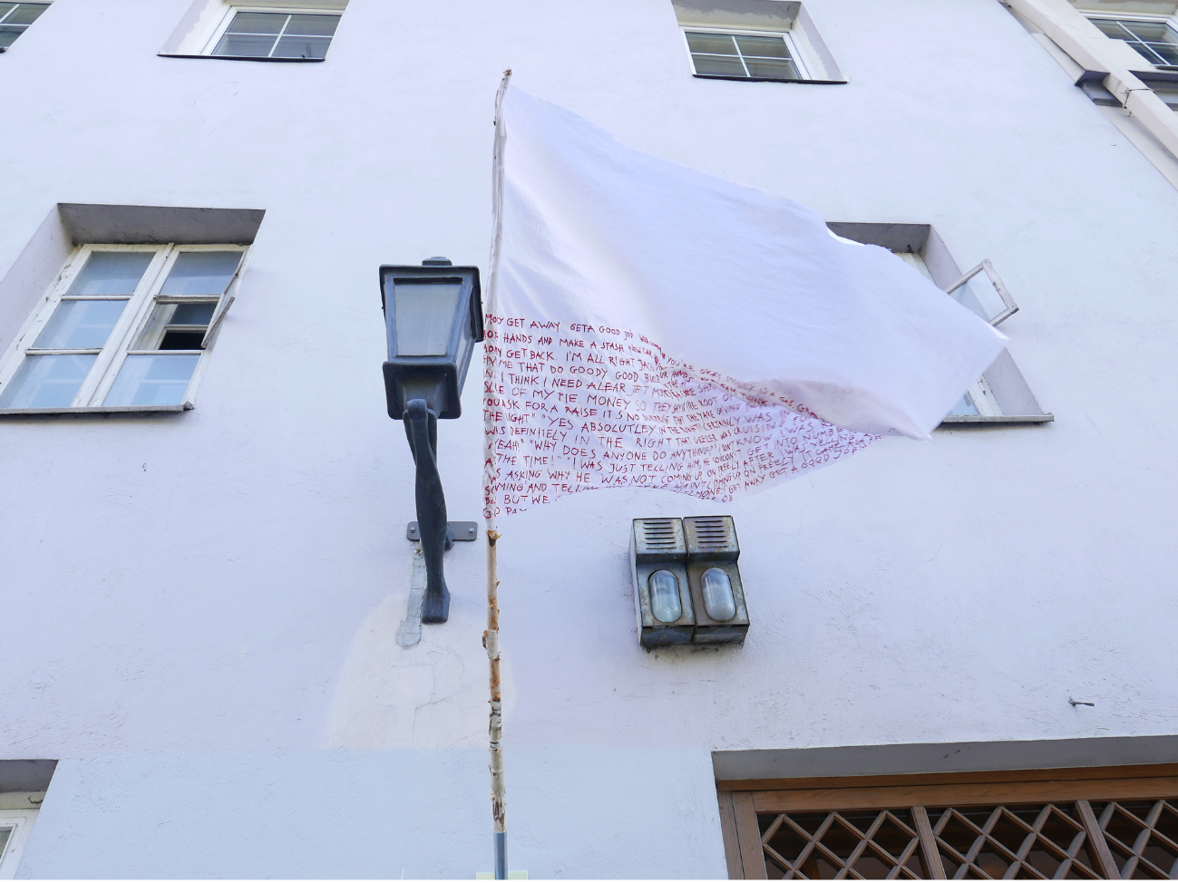 Seria prac Flagi to obiekty wykonane techniką haftu ręcznego na białej tkaninie czerwoną nitką. Na materiale zostały przepisane (haftem) teksty piosenek, wierszyki, powiedzenia, wyliczanki. Flagi powstały we współpracy z różnymi grupami osób w ramach kilkudniowych otwartych warsztatów performatywnych w przestrzeni miejskiej lub galeryjnej.