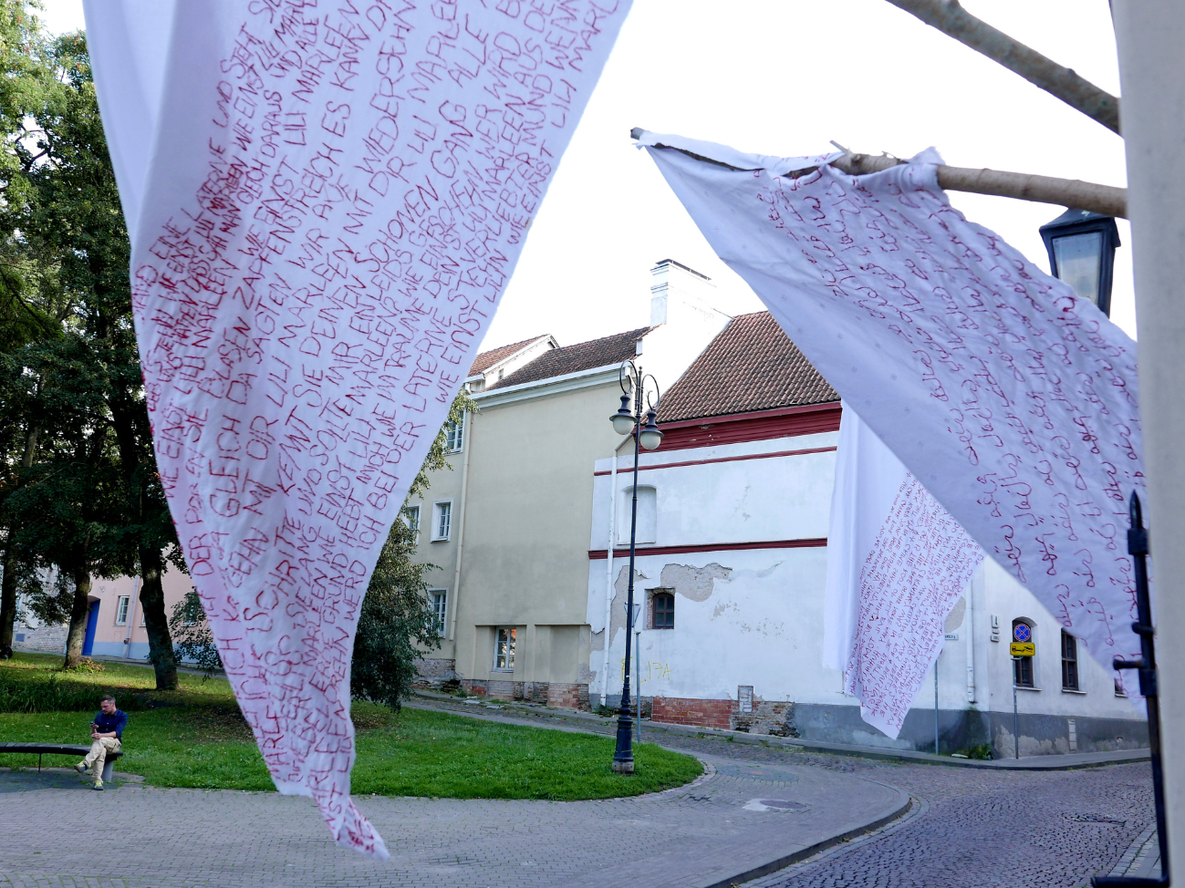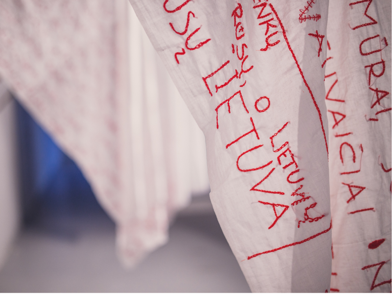 Flaga nr 4 została wyhaftowana tekstami litewskich piosenek ludowych, wyliczanek oraz powiedzonek o relacjach litewsko-polskich. Haft w języku litewskim. Flaga nr 4 powstała we współpracy z Polkami i Litwinkami mieszkającymi w Wilnie. Podczas haftowania flagi powstał film dokumentujący proces pracy, wyborów tekstów i osobistych trudnych relacji i stosunków Polaków z Litwinami. Współpraca z Centrum Sztuki Współczesnej Łaźnia z Gdańska i Galerią Artifex z Wilna w ramach Wilno Gallery Weekend.