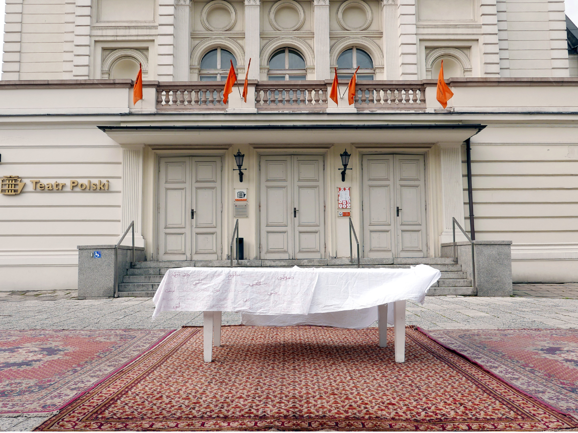 Flaga nr 5 to spektakl teatralny w formie warsztatu hafciarskiego. Flaga haftowana w języku polskim z osobami mieszkającymi i pracującymi w Warszawie. W projekcie wzięli udział aktorzy i aktorki, profesjonalni i amatorzy. Warsztat zrealizowany w formie spektaklu na scenie teatralnej stał się krytyką sztuki partycypacyjnej i zaangażowanej społecznie. Wszystkie odcinki spektaklu były reżyserowane, ale także pozostawiały przestrzeń do działań performatywnych.