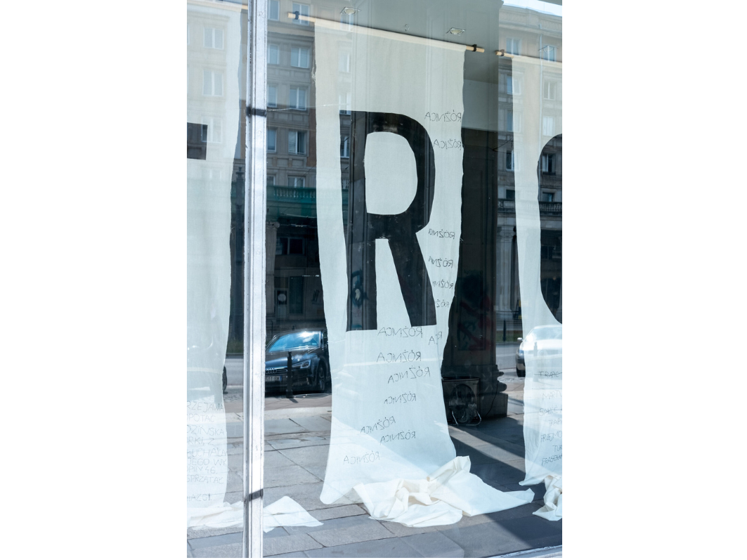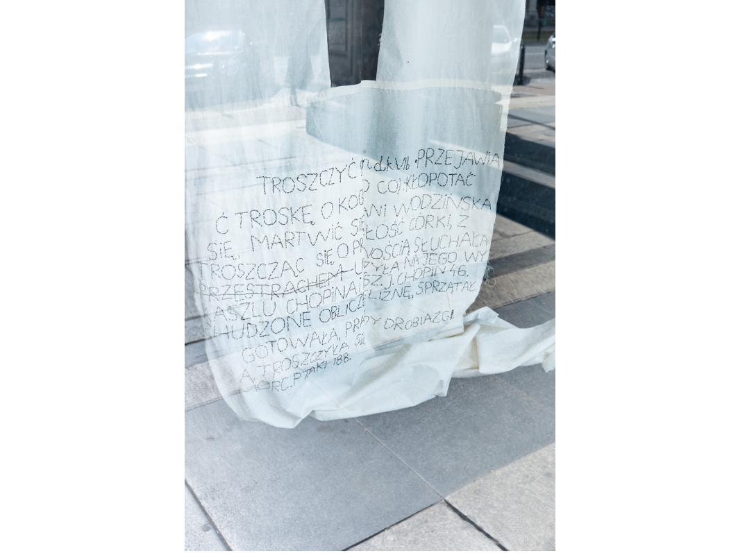 Wielkie, drukowane litery widoczne są już z chodnika przy ulicy Marszałkowskiej, ale żeby przeczytać wyhaftowane słowa, trzeba podejść bliżej. Na dziewięciu białych płótnach kłębią się hasła – niektóre przekreślone, inne w lustrzanym odbiciu. Smucić się, kłopotać, frasować, przejmować, niepokoić, obowiązki nie uczucia, uczucia nie obowiązki.