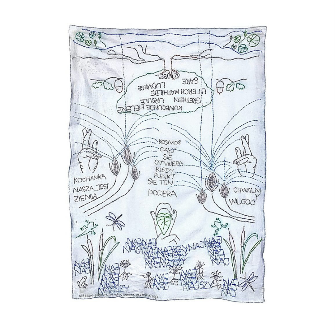 Agata Adamiecka-Sitek, członkini zespołu kuratorskiego WST tak pisała o haftowanym proporcu- plakacie: