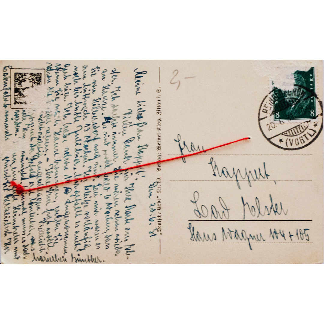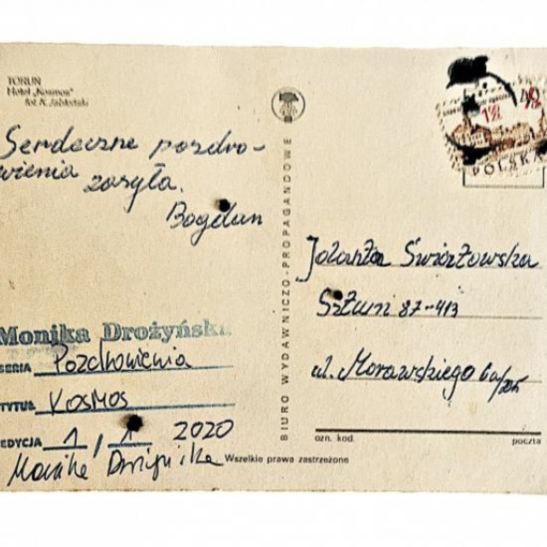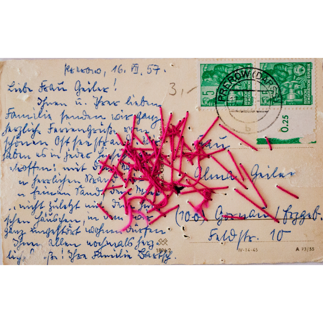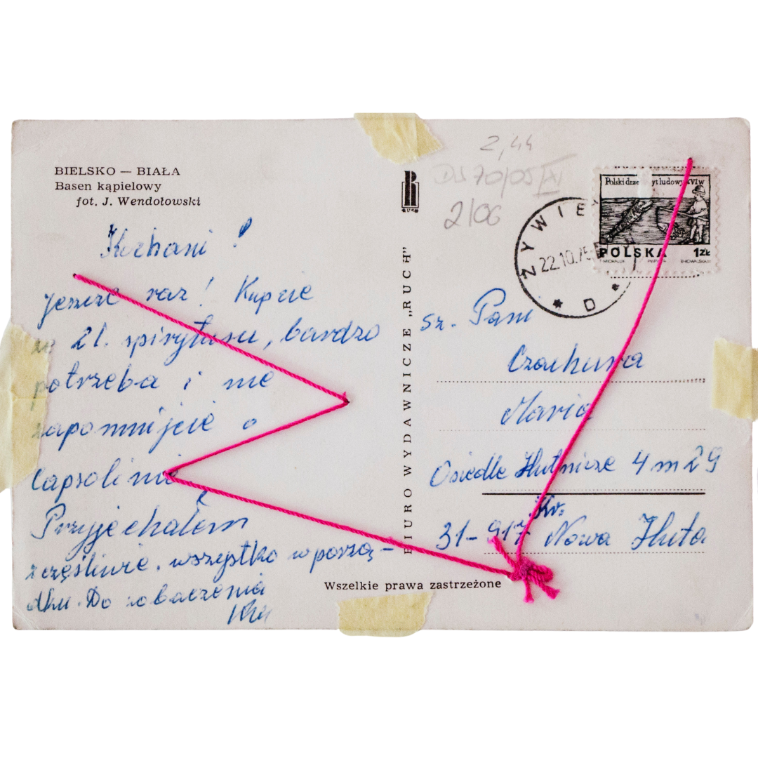 I found a collection of handwritten postcards, some from the pre-war era. It turned out that most were bought in one place but posted in another. I analysed the route the postcards had travelled and created embroideries, which serve as a record of forgetting. On the back of one postcard, we can read: “Bogdan sends warm greetings.” He sent them to Jolanta, who may have been waiting for them. With the work Greetings, I send warm greetings to all who will see it, in the hope that they will pass on this kindness.
