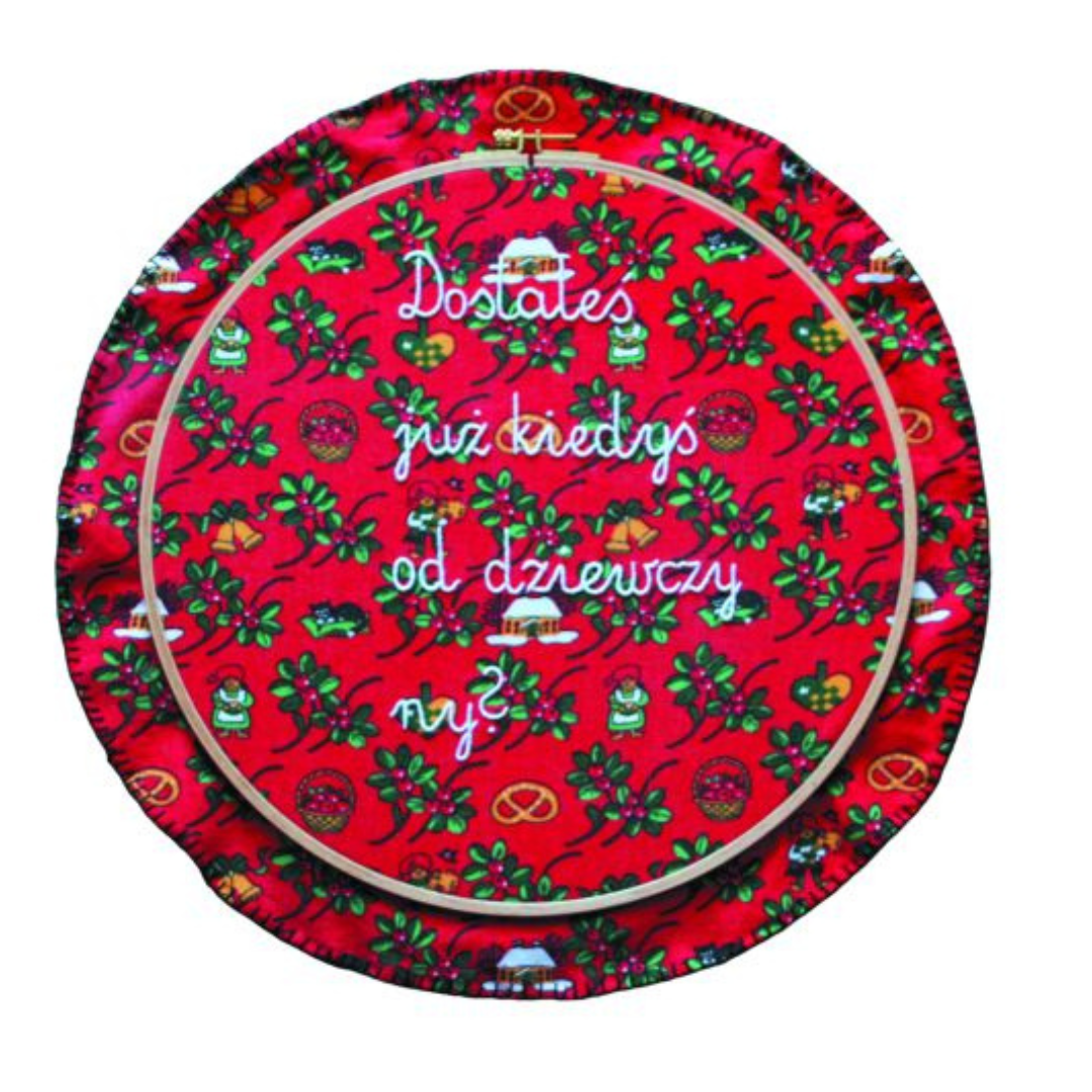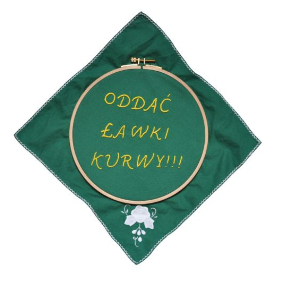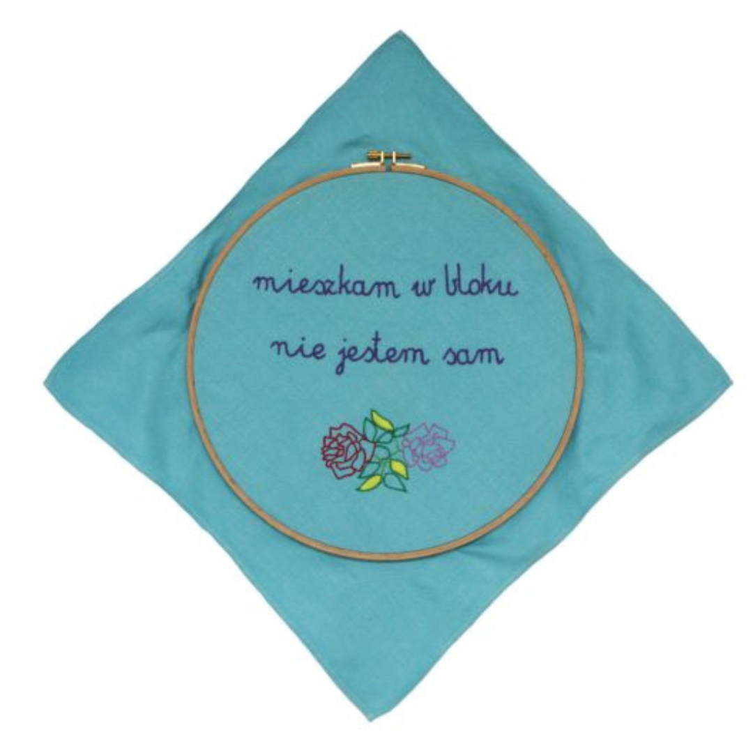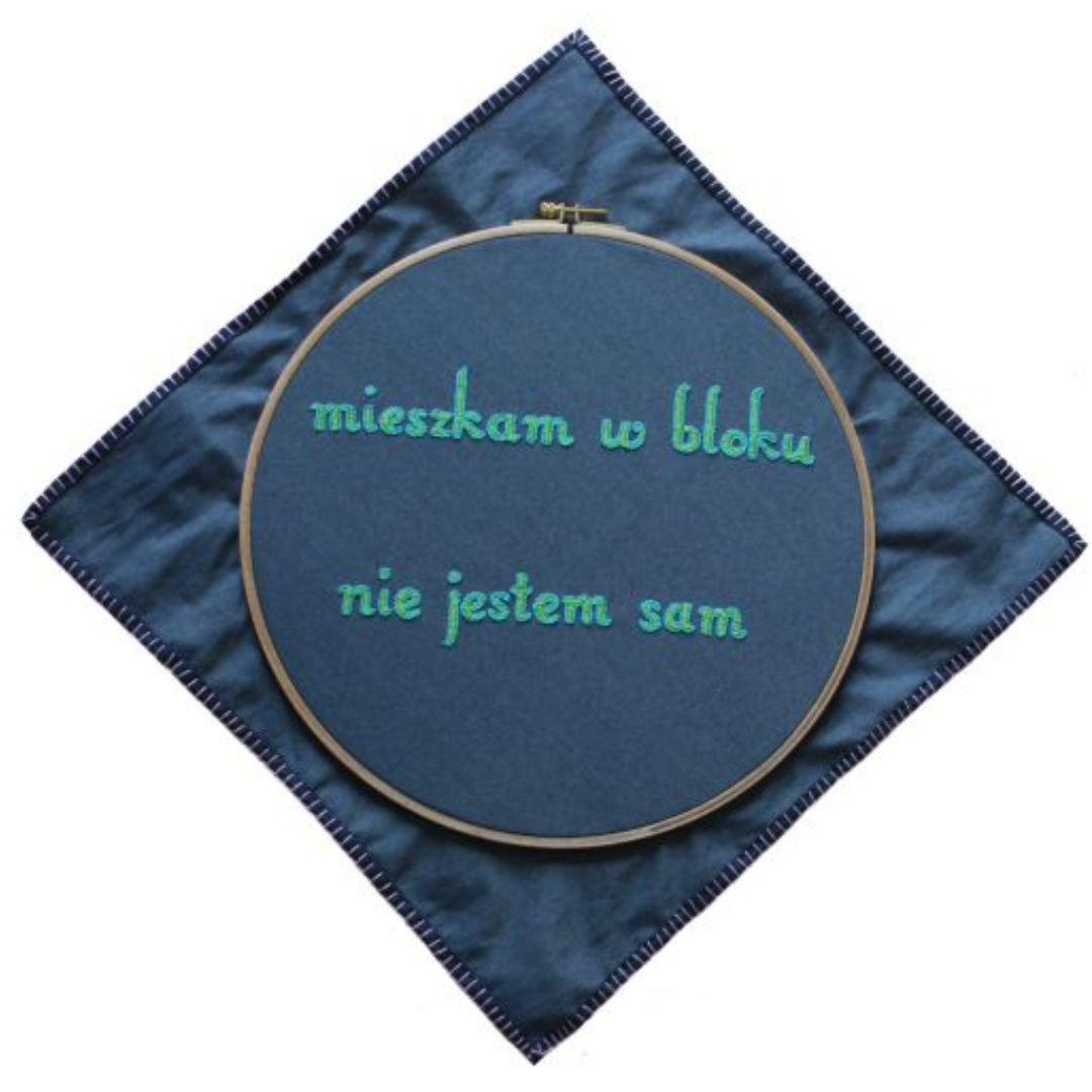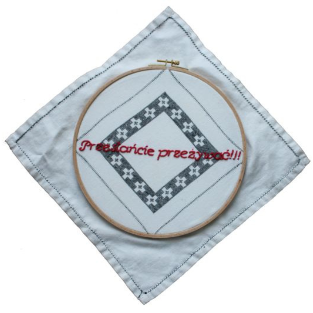 I never saw my mother or my grandmother embroider. I started embroidering in 2008, during Uszyj dom kultury/Sew yourself a community centre, when I spent my days sewing and smoking cigarettes. In moments of idleness, I read the graffiti covering the side wall of the neighbouring block of flats. As I sewed, smoked, and read, I wondered how to transcribe these words written on the walls. Maybe that’s why I chose to use needle and thread. Since then, I have treated embroidery as a writing technique. I examine how words can function in different spaces, and what kind of relationship is forged between content and form. My collection of embroidered works now includes dozens of pieces.
