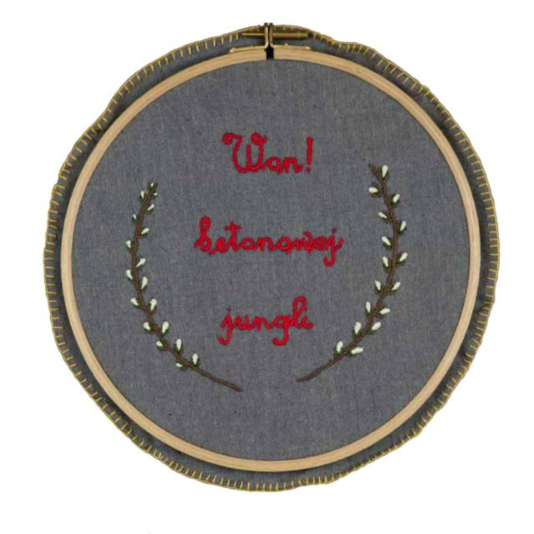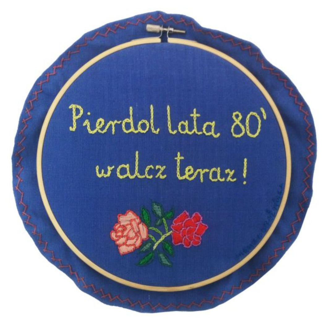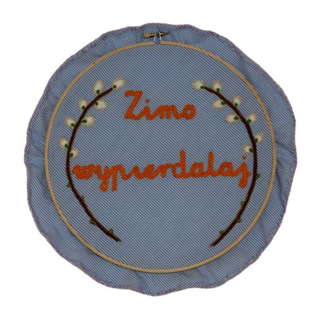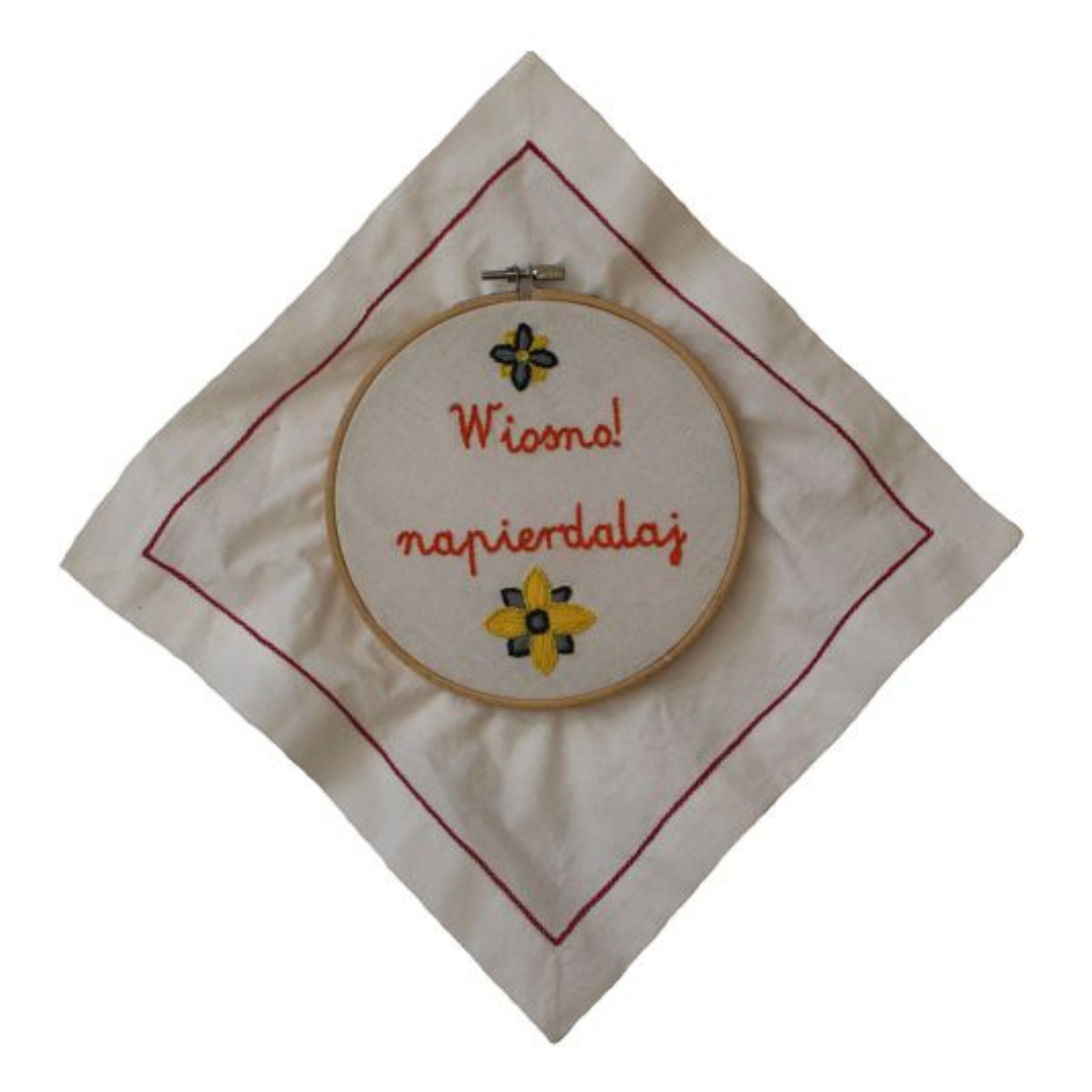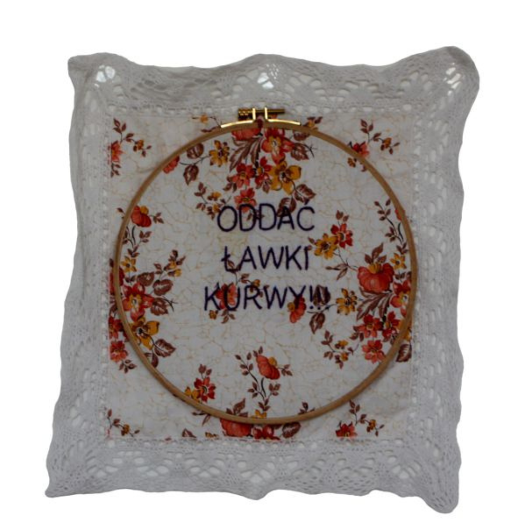 I never saw my mother or my grandmother embroider. I started embroidering in 2008, during Uszyj dom kultury/Sew yourself a community centre, when I spent my days sewing and smoking cigarettes. In moments of idleness, I read the graffiti covering the side wall of the neighbouring block of flats. As I sewed, smoked, and read, I wondered how to transcribe these words written on the walls. Maybe that’s why I chose to use needle and thread. Since then, I have treated embroidery as a writing technique. I examine how words can function in different spaces, and what kind of relationship is forged between content and form. My collection of embroidered works now includes dozens of pieces.