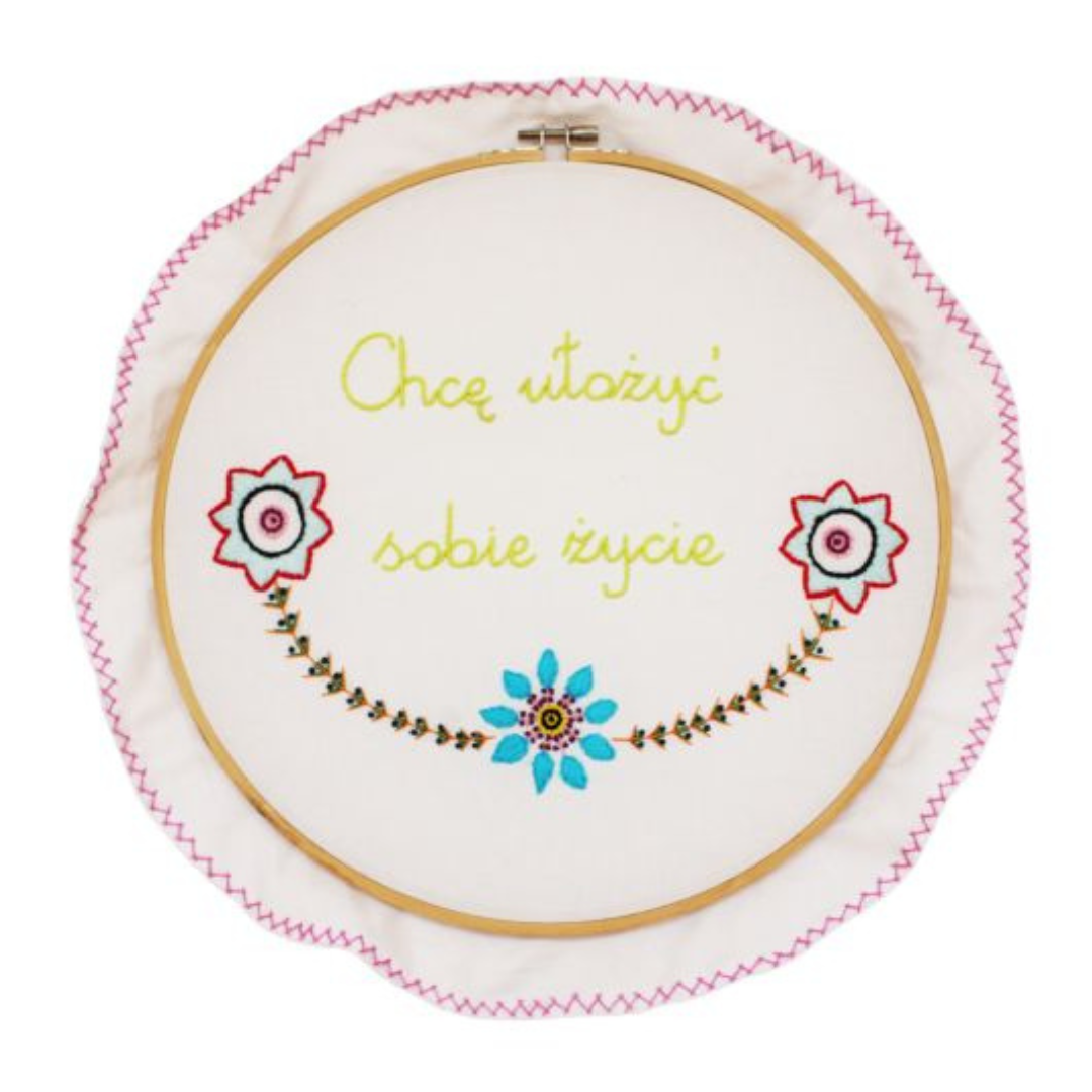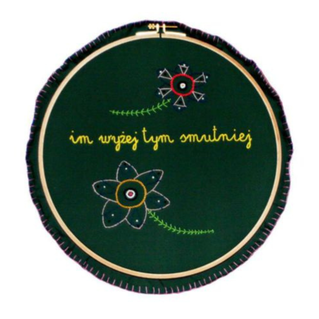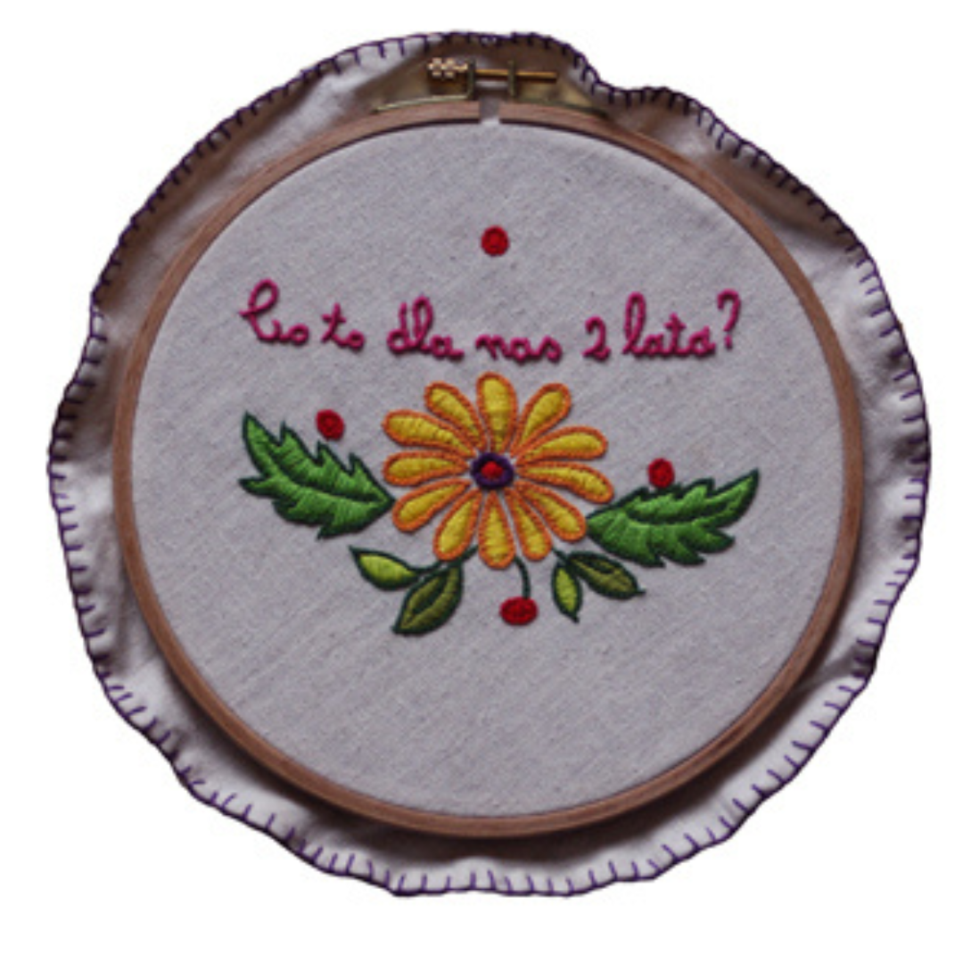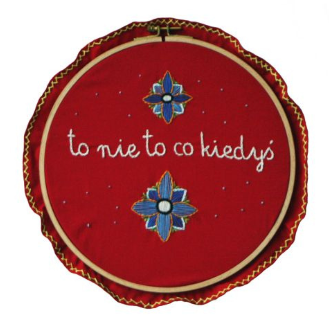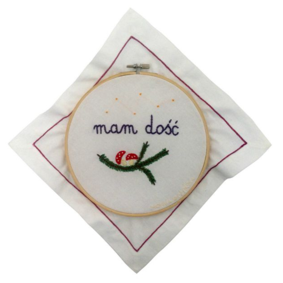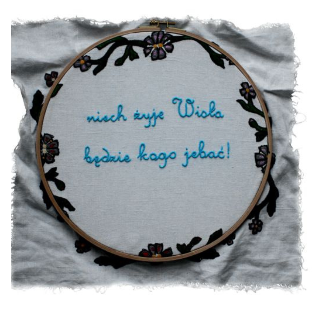 I never saw my mother or my grandmother embroider. I started embroidering in 2008, during Uszyj dom kultury/Sew yourself a community centre, when I spent my days sewing and smoking cigarettes. In moments of idleness, I read the graffiti covering the side wall of the neighbouring block of flats. As I sewed, smoked, and read, I wondered how to transcribe these words written on the walls. Maybe that’s why I chose to use needle and thread. Since then, I have treated embroidery as a writing technique. I examine how words can function in different spaces, and what kind of relationship is forged between content and form. My collection of embroidered works now includes dozens of pieces.