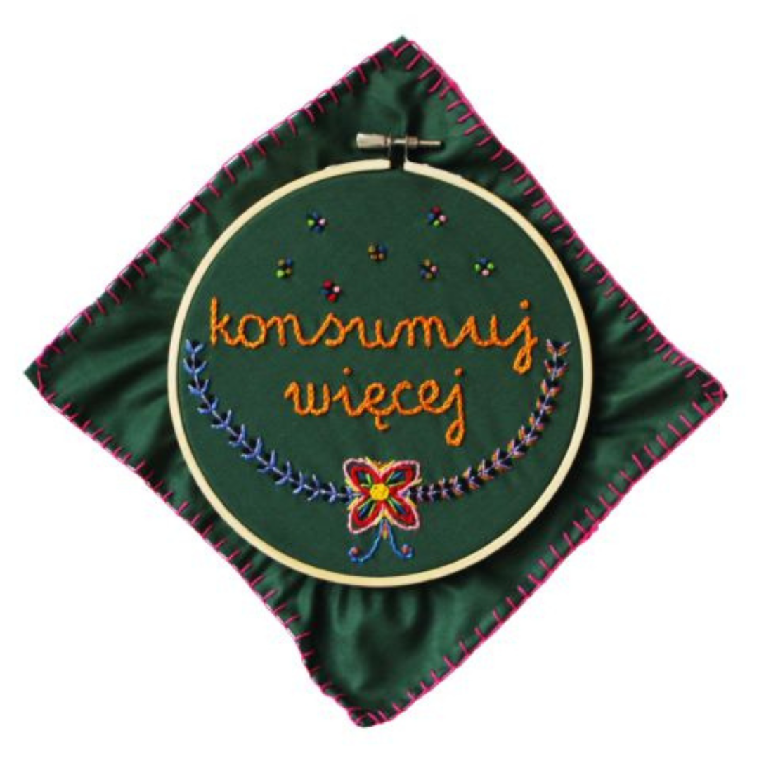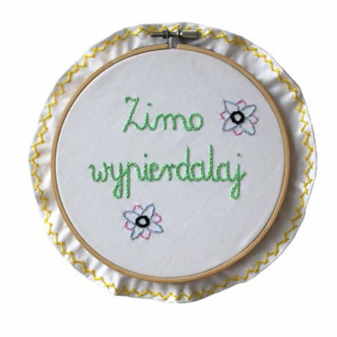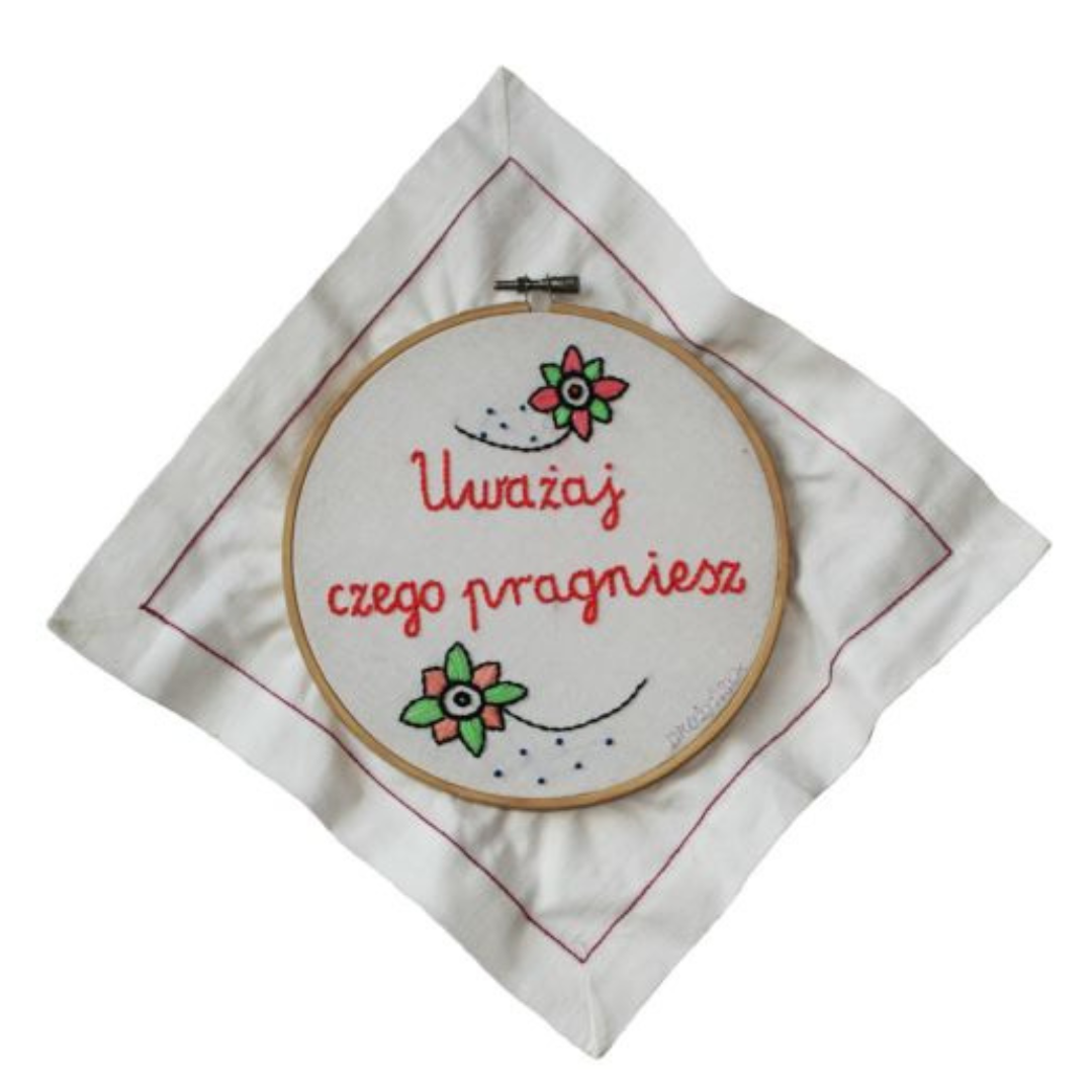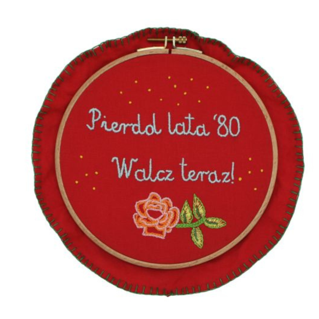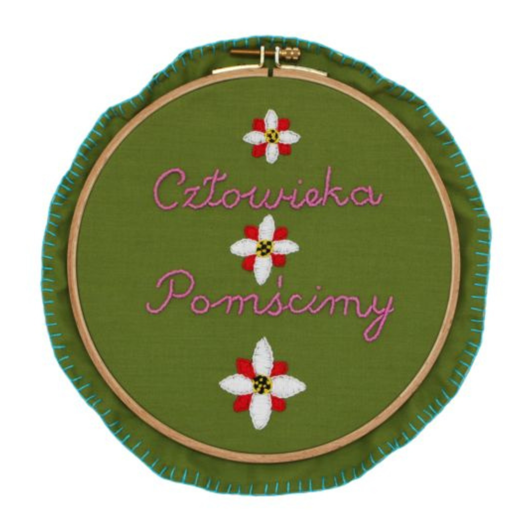I never saw my mother or my grandmother embroider. I started embroidering in 2008, during Uszyj dom kultury/Sew yourself a community centre, when I spent my days sewing and smoking cigarettes. In moments of idleness, I read the graffiti covering the side wall of the neighbouring block of flats. As I sewed, smoked, and read, I wondered how to transcribe these words written on the walls. Maybe that’s why I chose to use needle and thread. Since then, I have treated embroidery as a writing technique. I examine how words can function in different spaces, and what kind of relationship is forged between content and form. My collection of embroidered works now includes dozens of pieces.
